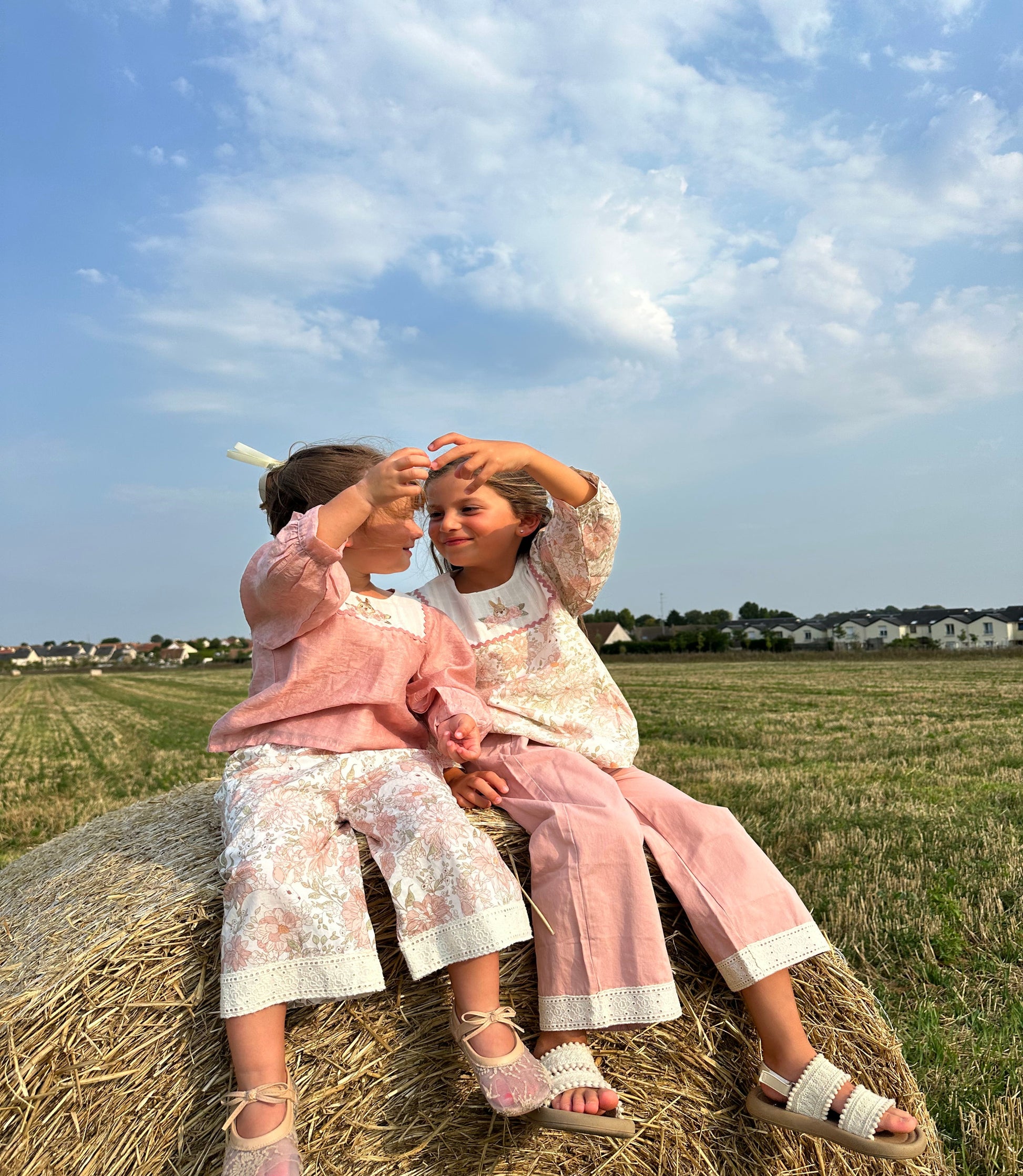 Ensemble deux pièces composé d'un haut rosé et d'un pantalon fluide à imprimé floral sublimé par des détails en dentelle