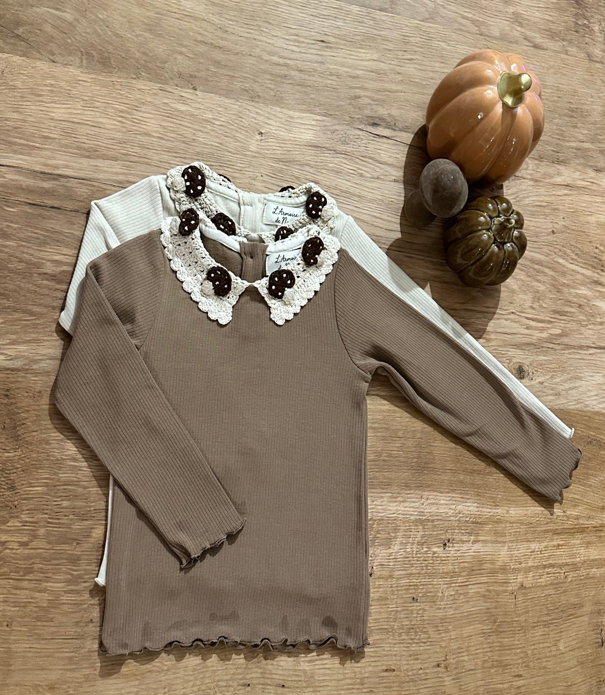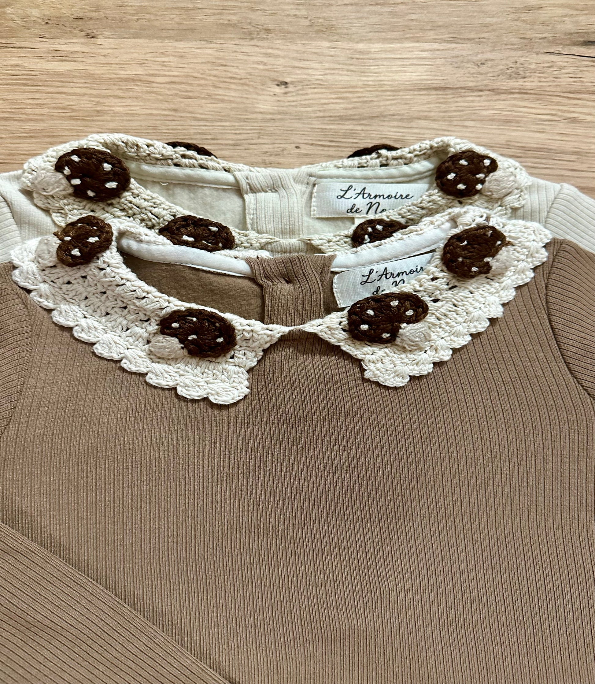 Haut côtelé manches longues avec un col décoré de petits champignons. L’intérieur est tout doux et bien chaud.