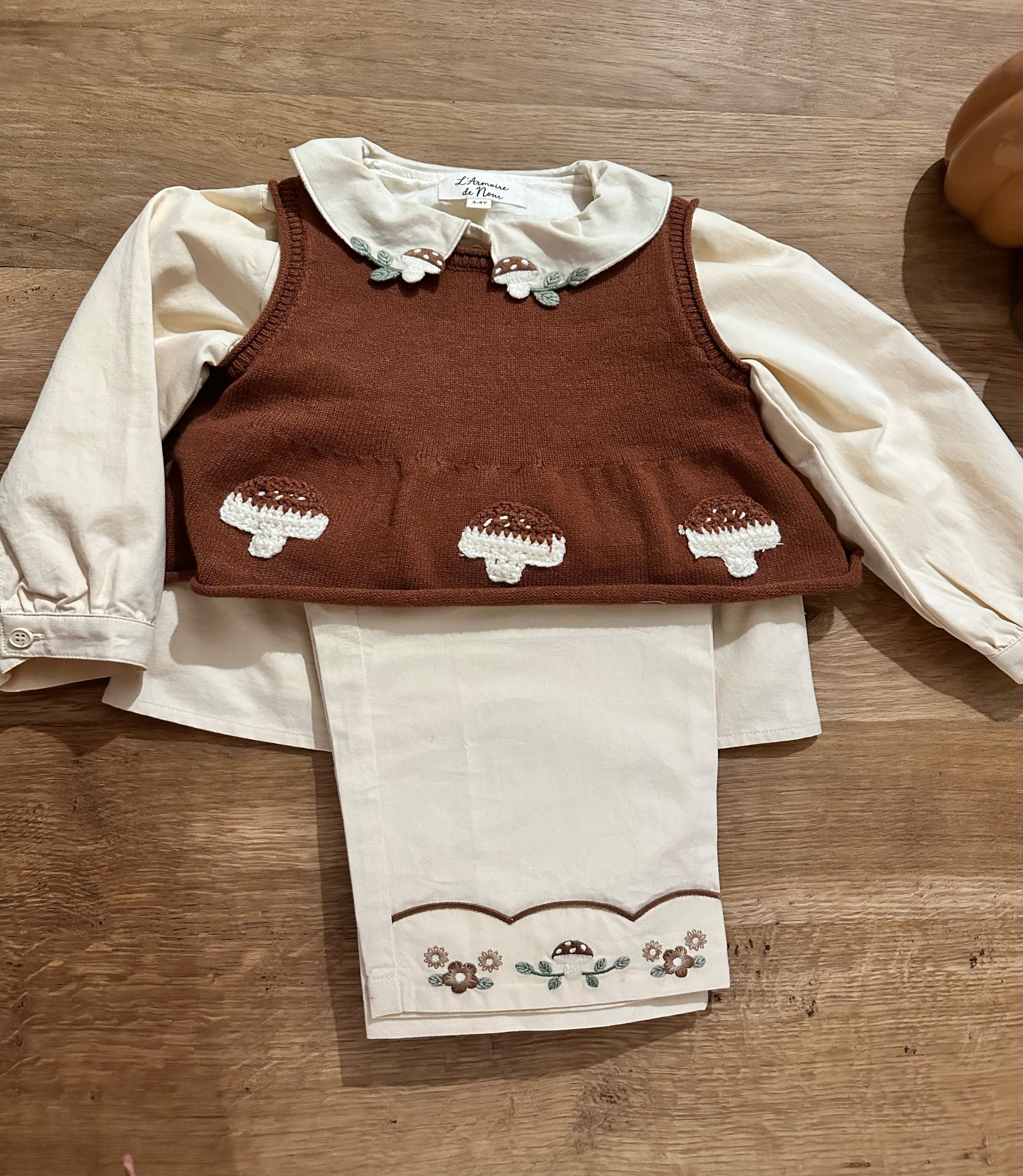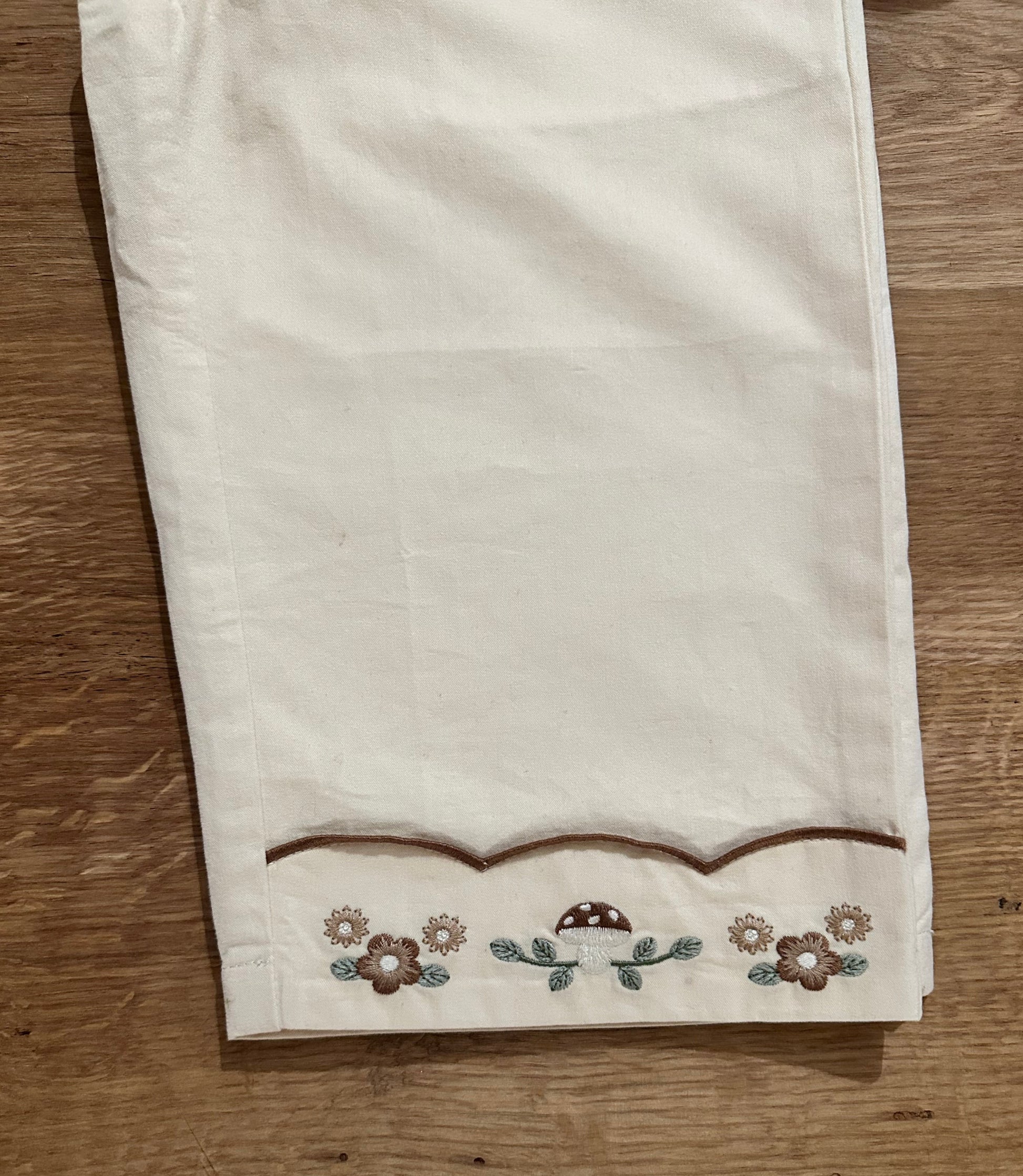 Pantalon souple et confortable, décoré en bas de jambe de broderies champignons et petites fleurs.