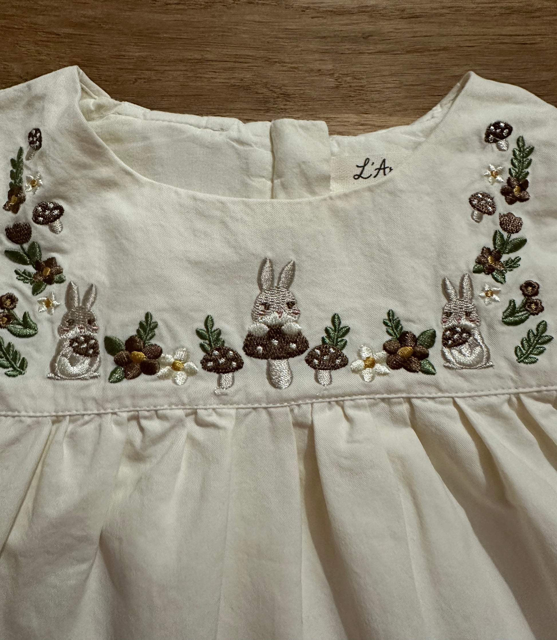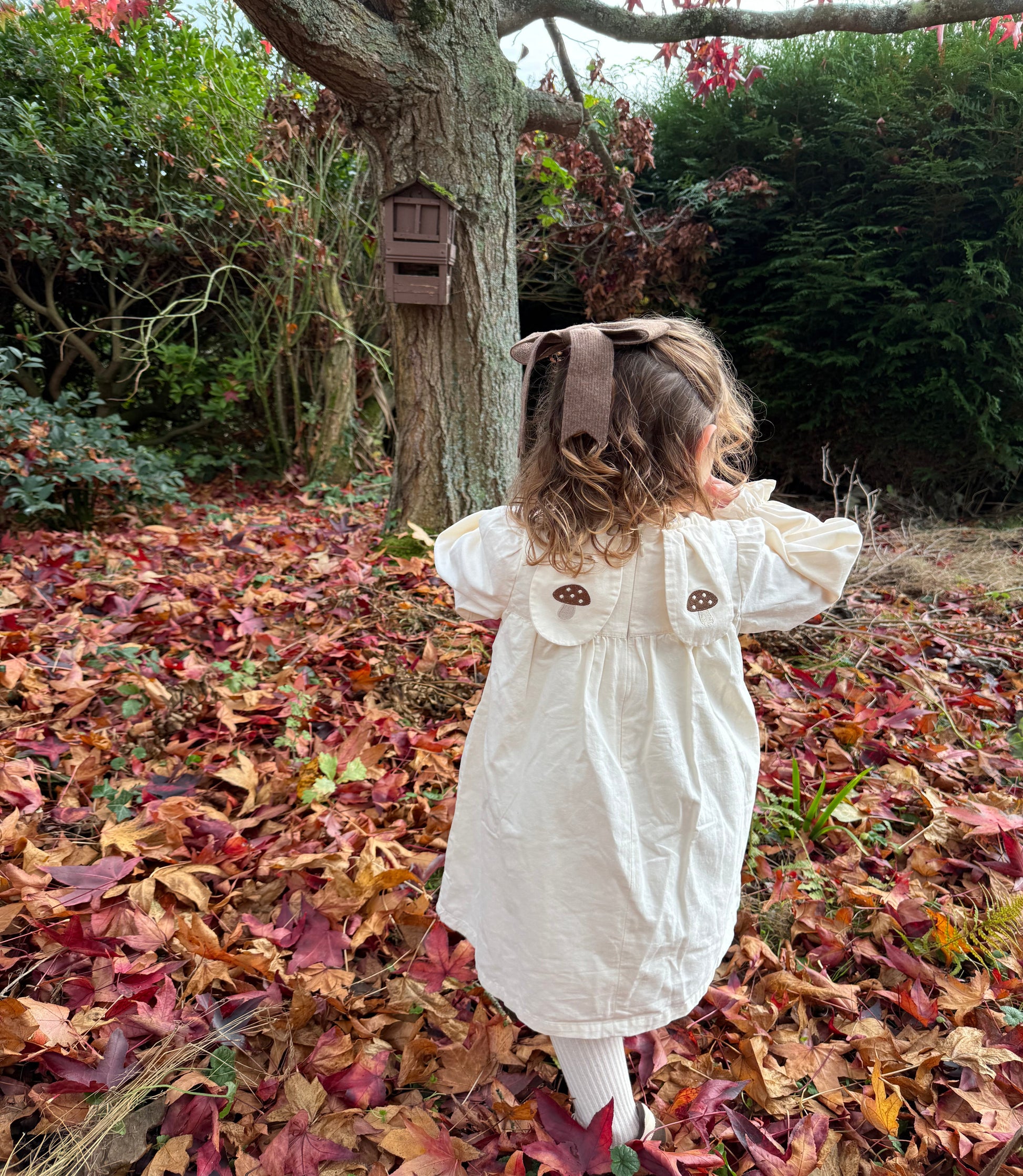 Ravissante robe crème au charme automnal, ornée de délicates broderies de petits motifs forestiers et agrémentée de poches à volants finement décorées.